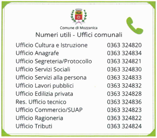 Tutte le informazioni possono essere richieste telefonicamente agli uffici comunali, anche attraverso e-mail, così come gli appuntamenti da prenotare ai seguenti numeri: