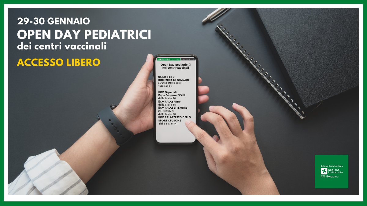 Nelle giornate di SABATO 29 e DOMENICA 30 GENNAIO per gli open day pediatrici saranno attivi, SENZA PRENOTAZIONE, con tessera sanitaria e carta d'identità del minore e del genitore i centri vaccinali di: