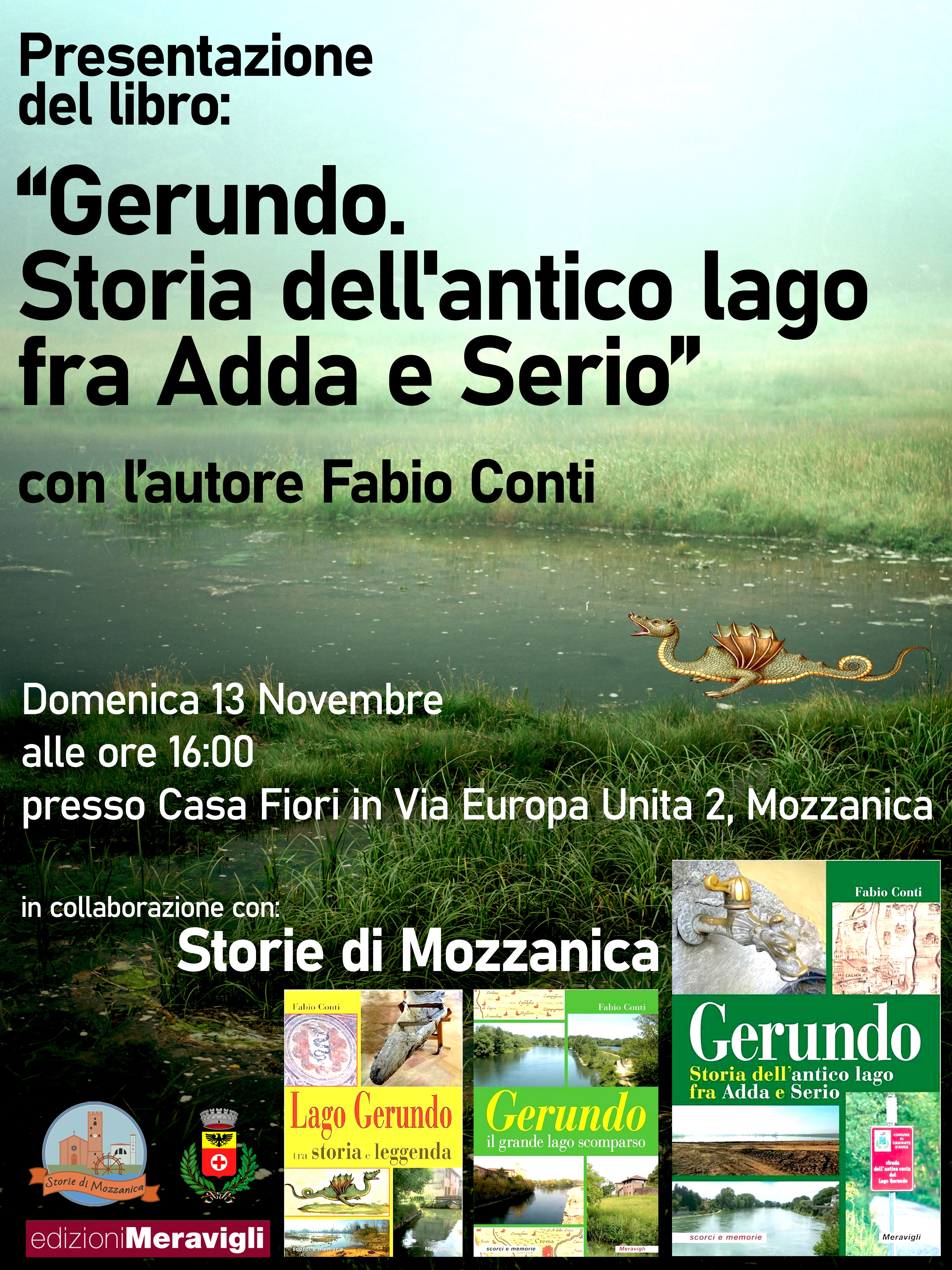Domenica 13 novembre, alle ore 16:00, presso Casa Fiori, si terrà la presentazione del libro di Fabio Conti intitolato "Gerundo. Storia dell'antico lago fra Adda e Serio", in collaborazione con Storie di Mozzanica e col patrocinio del Comune di Mozzanica.