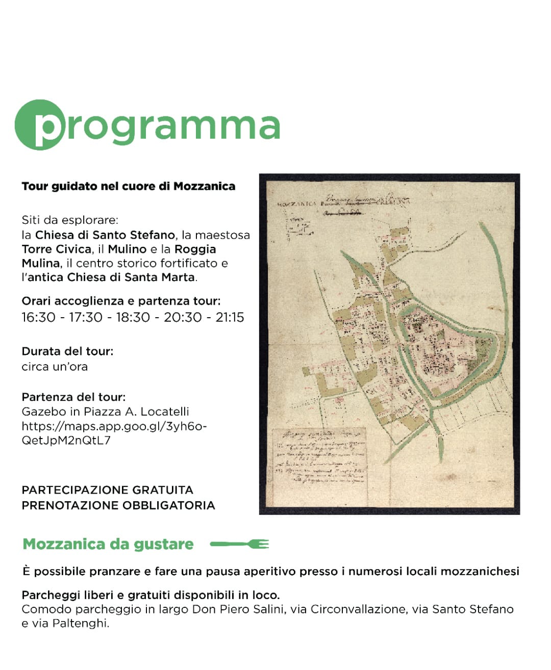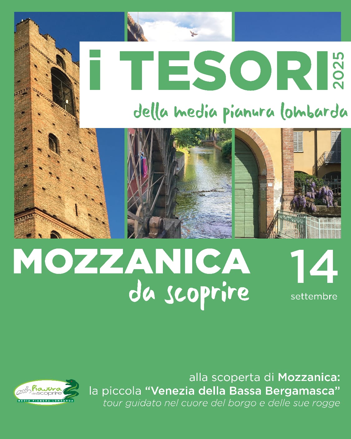 Ad aprire il calendario “Mozzanica da Scoprire” domenica 14 settembre dalle ore 16:30. Una giornata all’insegna della riscoperta del territorio e della valorizzazione della “piccola Venezia”, con tour guidati gratuiti con prenotazione obbligatoria tra le vie del centro storico fortificato, il Mulino e le suggestive rogge (orari dei tour da piazza Locatelli 16:30; 17:30; 18:30; 20:30; 21:15). L’evento è organizzato da Pianura da Scoprire e dal Comune di Mozzanica in collaborazione con Storie di Mozzanica nell’ambito delle giornate dedicate ai “Tesori della Media Pianura Lombarda”.