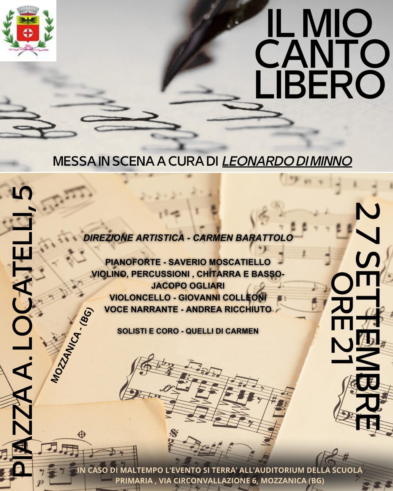 Sabato 27 settembre ore 21:00 in piazza Locatelli “Il mio canto libero”. Spettacolo teatral-musicale con musica dal vivo dedicato al cantautorato italiano: da Lucio Dalla a Claudio Baglioni, da Renato Zero a Pino Daniele, da Riccardo Cocciante a Franco Battiato. Regia generale affidata a Leonardo Di Minno, autore e performer del musical Notre Dame de Paris di Riccardo Cocciante.